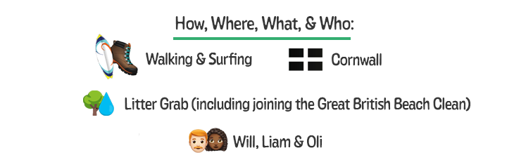 Probably Oli's favourite trip, we walked 99km down the coast, surf loads and grabbed tonnes of litter. Probably worth saying we didn't collect tonnes on our own, we were part of the Great British Beach Clean which did collect a lot. This EcoTrip basically saw us walking from beach to beach, clean the beach then surf off the beach. It's a great route to do (see map below) with lots of coves, witchcraft and boozers along the way.